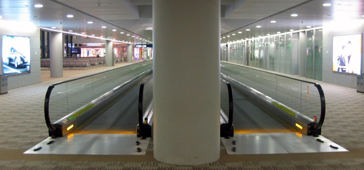 پیاده رو برقی برای سرعت بخشیدن و نظم دادن به حرکت افراد نقش بسزایی دارد و به صورت کاملاً افقی (زاویه صفر) نصب می شود.